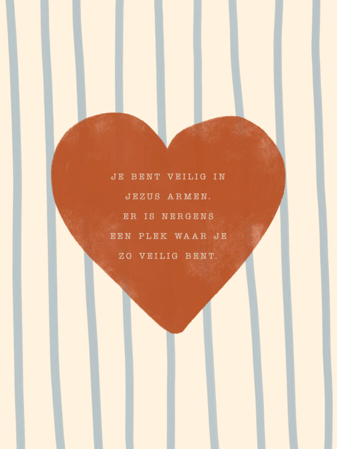 Deze toffe poster met de tekst: ‘je bent veilig in Jezus armen’. Je kunt deze poster eventueel ook personaliseren met eigen tekst. Deze kun je terug vinden onder het kopje ‘posters met eigen tekst’. Combineer de poster met een lijst uit de webshop en de poster komt heel mooi tot z’n recht met het anti- spiegelende plexiglas.
