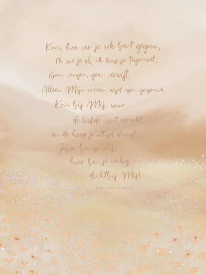 Deze prachtige poster is getekend door Liefwoord. Met een mooi gedichtje van imints geschreven aan de hand van Lukas 15 vers 20. Wil je met een eigen tekst? Dat kan ook, die staat onder het kopje: poster met eigen tekst. Daar kun je de poster personaliseren met eigen tekst. Deze poster is te bestellen in 2 verschillende afmetingen: 40×50 en 50×70 cm. Bestel er een mooie lijst van ons bij en de poster komt echt tot z’n recht. Dit omdat deze anti-spiegelend plexiglas hebben.